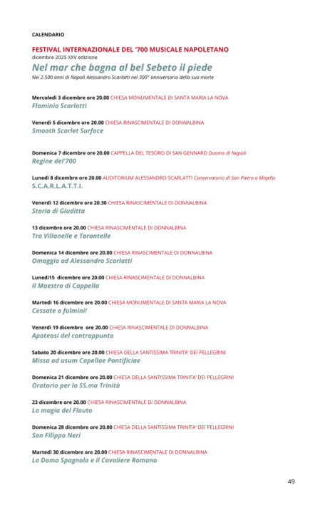 Il Festival Internazionale del ‘700 Musicale Napoletano , è un evento annuale promosso dalla Associazione Domenico Scarlatti e quest’anno si presenta alla sua XXIII edizione. Il Festival Internazionale del ‘700 Musicale Napoletano è un percorso nella memoria che pone al centro dell’attenzione il fruitore, vuoi turista o indigeno, comunicandogli la consapevolezza di trovarsi in luoghi di straordinaria bellezza, impregnate di cultura, musica, arte e storia e che proietta gli stessi in un nuovo modo di vedere e programmare il futuro.